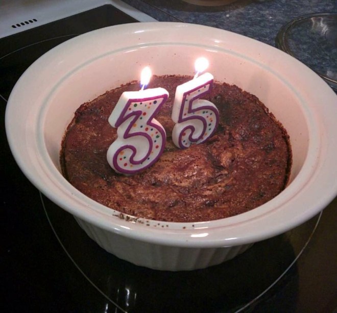 It was my thirty fifth birthday two days ago and I started this post in the bathroom that evening, supervising a splashy five year old kid – a kid I love – while my partner carved crockpot chickens for supper and the two year old watched Super Why.